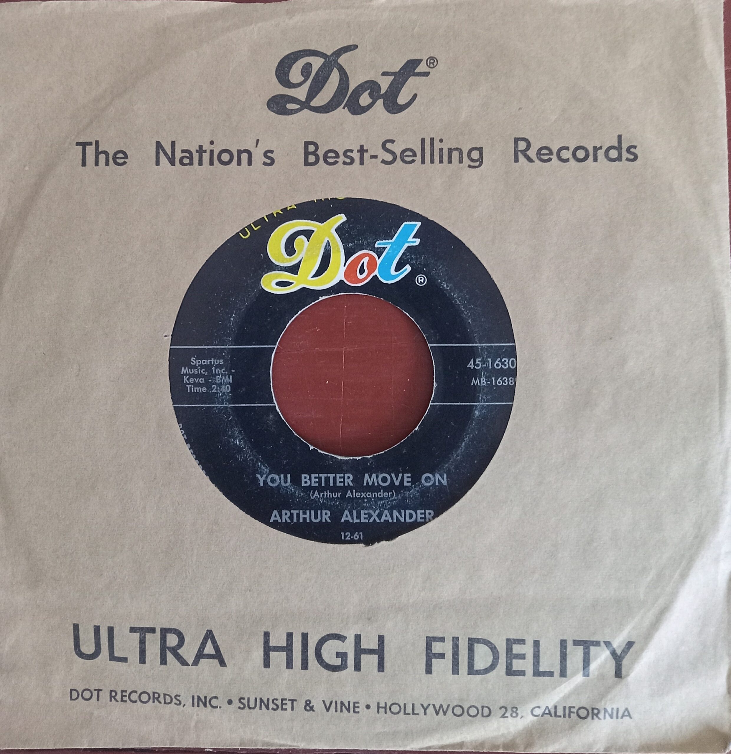 Dot Records was a Pop and Country & Western label formed in Gallatin Tennessee in 1951. This sleeve was used between 1956 and 1951. It had few Rhythm & Blues releases but this Arthur Alexander record is considered the first Country Soul song.